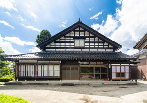 アズマダチの家は富山県西部の散居村に多くあります。散居村には個々の家が点在しており、冬の季節風、夏の暑い日差しなどを防ぐため、屋敷林(カイニョ)が植えられています。