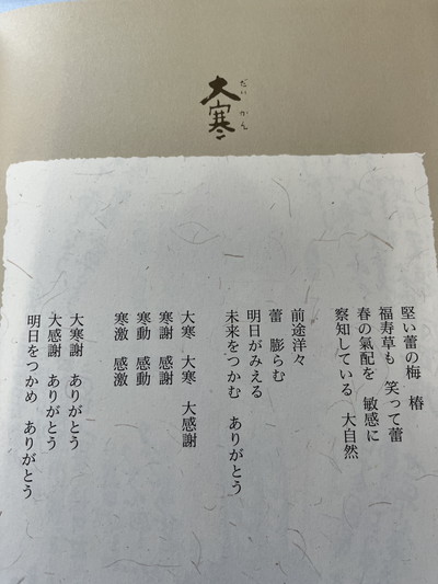 ホーム スタッフブログ 大寒 前の記事 一覧 次の記事 大寒 公開日:2026/01/20(火) 更新日:2026/01/20(火) すべて|すべて こんにちは!宮脇悦夫です。 今日は大寒 良い文章に出会いました。 出発点はたくさんあった方が良い。 仕切り直しもたくさんあった方が良い。 人生をより素敵に豊かにする二十四節気は、感謝報恩の真心を呼び起こします。 清水英雄氏 ありがとう二十四節気より大寒 前の記事 一覧 次の記事