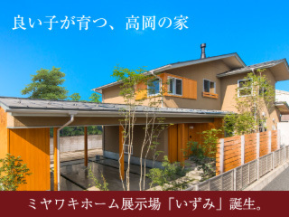 「良い子が育つ、高岡の家」新展示場「いずみ」が誕生します。自然と幸せが舞い降りる引き戸仕様、広がり間取りの家です。ミヤワキホームの本物の家づくり(本物の自然素材「木」と「紙」と「土」、熟練の大工により手刻み)も体感してください。是非、素足で歩いてみてください。