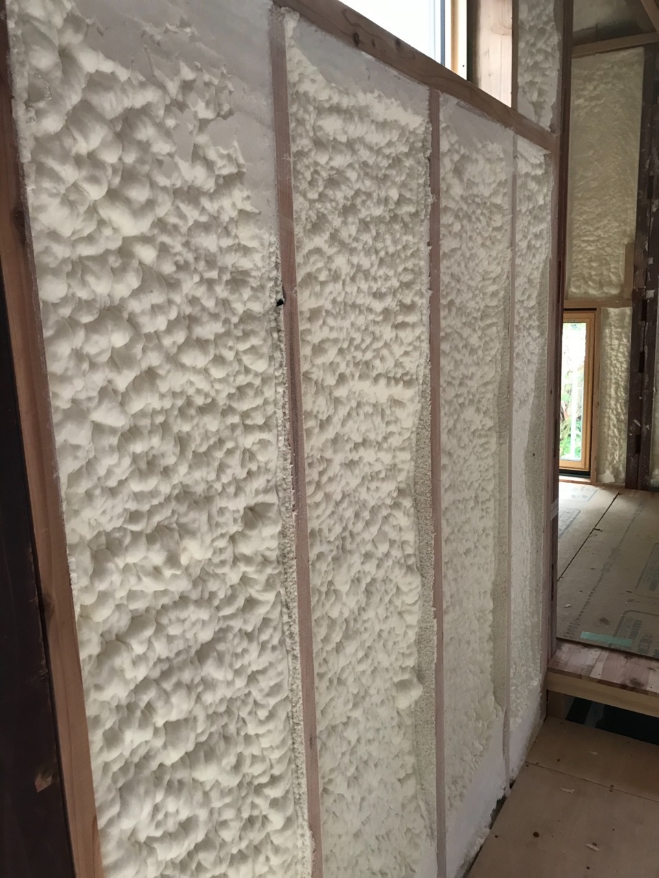 室内の吹付断熱材の施工が完了しました。高い断熱性と優れた気密性を持つ「吹付硬質ウレタンフォーム」は、お写真のように、もこもこの断熱材がお家の隅々まで全体を覆うので家中、温かくなります。