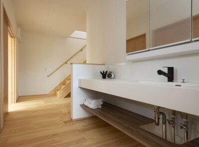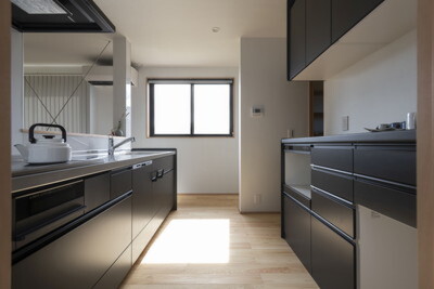 ホーム フォトギャラリー 地域 射水市 記憶を継ぐ、瑠璃色の和室と猫の家 記憶を継ぐ、瑠璃色の和室と猫の家 高岡市 地域|射水市 LDK 大きな掃き出し窓からは豊かな緑が望め、季節の移ろいを感じながらゆったりとした時間をお過ごしいただけます。 たてに流れるラインが美しいタテ型ブラインド。操作バトンの位置が高く、小さなお子さまやペットのいる家庭でも誤操作の心配がありません。 床:あづみの松 カーテン:ニチベイ たて型ブラインド バトン式 画像のみを表示全 9 枚中 1 枚目を表示Next ≫ トイレ 空間を有効活用するコーナータイプの収納キャビネット。トイレットペーパーや掃除用品などをすっきり収納しながら、圧迫感を与えません。下部のカウンターにはグリーンやアートを飾るスペースも。機能性とデザイン性を両立し、お客様をお通しする際にも安心の美しい空間を保てます。 床:コルクタイル 壁:玉紙 雲華 TM-160 天井:玉紙 雲華 TM-160 収納キャビネット:TOTO コーナー収納キャビネット (トイレットペーパーのみだと12個収納可能)画像のみを表示全 9 枚中 2 枚目を表示≪ Prev|Next ≫ 和室 鮮やかな瑠璃(るり)色の壁と大胆な濃いブラウンの天井が、モダンで刺激的な空間を演出しています。 床:いぐさ畳 縁あり(ブラック) 壁:玉紙 もみ MA-8102(瑠璃色) 天井:玉紙 梨地 MAー8302画像のみを表示全 9 枚中 3 枚目を表示≪ Prev|Next ≫ キャットドアと階段 猫さんが行きたい場所にいつでも移動できるようにしました。 階段も手すりを壁側だけにしたことで、すっきりした印象。猫さんにとってはキャットウオークのように遊べそうです。画像のみを表示全 9 枚中 4 枚目を表示≪ Prev|Next ≫ キッチン 木目とブラックの強いコントラストが美しい、モダンなI型キッチン。明るい光が差し込む空間で、快適な料理時間を楽しめます。 キッチン:間口 255cm 奥行 65cm 高さ 85cm クリナップ STEDIA 扉カラー スエードチャコール 取手 ラインブラック 画像のみを表示全 9 枚中 5 枚目を表示≪ Prev|Next ≫ LDK 壁と柱の間をX字型に渡るコボットは、デザインを損なうことなく建物の強度を高め、窓の外へ視界がぬける設計を実現。このアクセントが、シンプルながらも個性的な空間を作り上げています。画像のみを表示全 9 枚中 6 枚目を表示≪ Prev|Next ≫ 2階 子ども室 6帖という空間でありながら、入り口から視線の先に大きな窓があるため、実際の広さ以上に開放感にあふれたゆとりのある空間に感じられます。たっぷりの自然光が差し込む、明るいお部屋です。 床:あづみの松 壁:クロス リリカラ LR-70843 天井:クロス リリカラ LR-70843 画像のみを表示全 9 枚中 7 枚目を表示≪ Prev|Next ≫ 2階 フリースペース 印象的なドアの向こうは、旧宅の小屋裏収納。 開放感あふれる2階のフリースペースは、ライフステージに合わせて表情を変えます。セカンドリビング、ライブラリー、ディスプレーコーナーなど様々。「何をしよう?」と考える時間も、きっと楽しいひとときになるでしょう。 床:あづみの松 壁:クロス リリカラ LR-70843 天井:クロス リリカラ LR-70843画像のみを表示全 9 枚中 8 枚目を表示≪ Prev|Next ≫ 洗面台 洗面カウンター×棚板のシンプルな形。ボウルなどのパーツを組み合わせて自分好みに。 キッチンの扉カラーと給水栓金具の色を同系色にすることで家全体のカラーバランスが抜群です。 AICA STYLISH COUNTER アンダーボウルタイプ 間口 100cm 奥行 55cm 高さ 80cm画像のみを表示全 9 枚中 9 枚目を表示≪ Prev 一覧へ戻る 新築 リフォーム 地域 すべて すべて 高岡市 射水市 富山市 氷見市 小矢部市 南砺市 砺波市